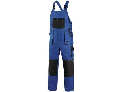 Pánské montérkové kalhoty s náprsenkou, náprsní kapsa na zip, pas vzadu do gumy, přední kapsy, boční kapsa na svinovací / skládací metr, boční kapsa na mobil / peněženku, zdvojená kolena, zadní kapsa s klopou, šle s gumou vzadu, reflexní doplňky.
